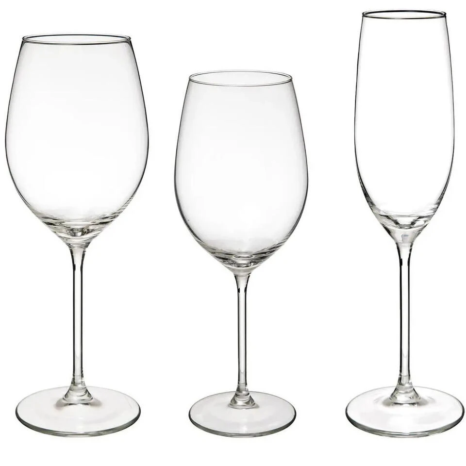 Set van 18x wijnglazen en champagneglazen 210/410/540 ml van glas. Een complete set met 6x wijnglazen voor witte wijn en 6x voor rode wijn en 6x champagneglazen/flutes. Afmetingen: ca. D4,5 x H23 cm, D6 x H22 cm en 6,5 x 23,5 cm. Inhoud: ca. 210 ml/21 cl, 410 ml/41 cl en 540 ml/54 cl. Materiaal: glas. Reinigen: vaatwasser geschikt. Serie: Lina.