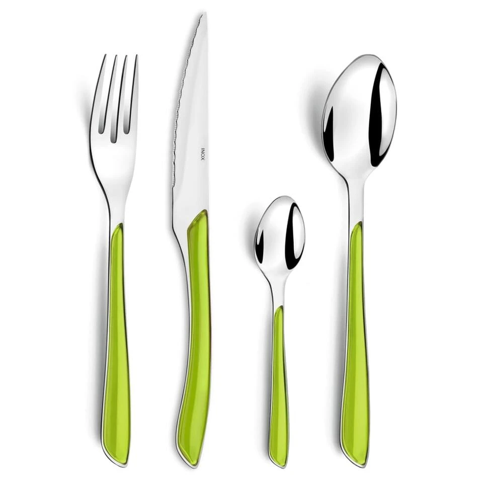 Elke gedekte tafel ziet er nog mooier uit met deze Eclat bestekset van Amefa. Deze moderne set bestaat uit 24 18/0 roestvrijstalen onderdelen: 6 tafelmessen, 6 tafelvorken, 6 tafellepels en 6 middelgrote theelepels, elk met een kleurrijk handvat. Bovendien is deze set vaatwasmachinebestendig en het gebruikte chroomnikkelstaal biedt een hoge corrosieweerstand en een diepe spiegelafwerking. Amefa bestek is een prachtige aanvulling op elke eetgelegenheid en is de ideale, levendige combinatie met ander bestek.