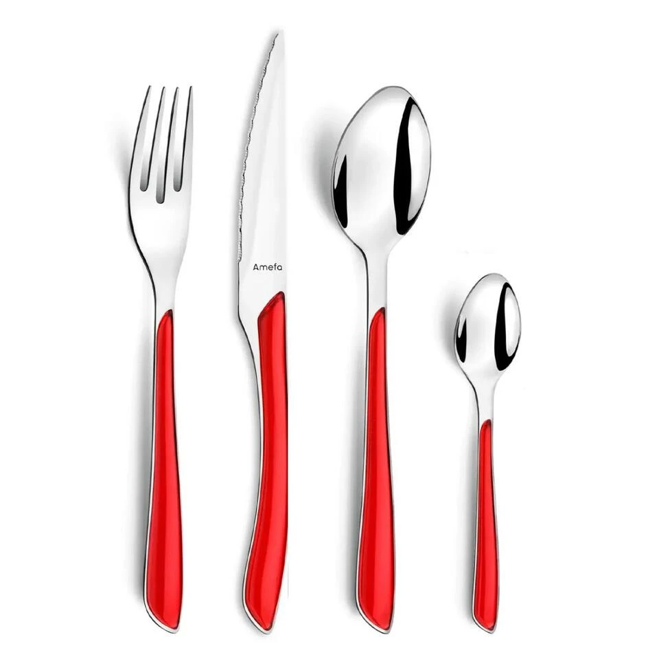 Elke gedekte tafel ziet er nog mooier uit met deze Eclat bestekset van Amefa. Deze moderne set bestaat uit 24 18/0 roestvrijstalen onderdelen: 6 tafelmessen, 6 tafelvorken, 6 tafellepels en 6 middelgrote theelepels, elk met een kleurrijk handvat. Bovendien is deze set vaatwasmachinebestendig en het gebruikte chroomnikkelstaal biedt een hoge corrosieweerstand en een diepe spiegelafwerking. Amefa bestek is een prachtige aanvulling op elke eetgelegenheid en is de ideale, levendige combinatie met ander bestek.