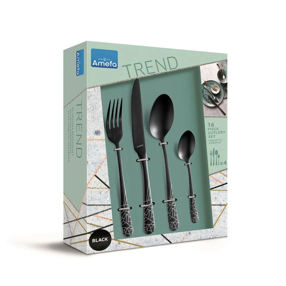 Austin bestek van Amefa creëert karakter en charme voor op tafel. En dat geldt helemaal voor Austin Frost. Bestekmodel Austin Frost is geïnspireerd op de ‘Scandinavia meets Japan’ designtrend. Het handvat van dit zwarte bestek is gedecoreerd met de abstracte laser print van een bevroren meer. <br><br>Deze 16-delige bestekset bestaat uit:<br><br>