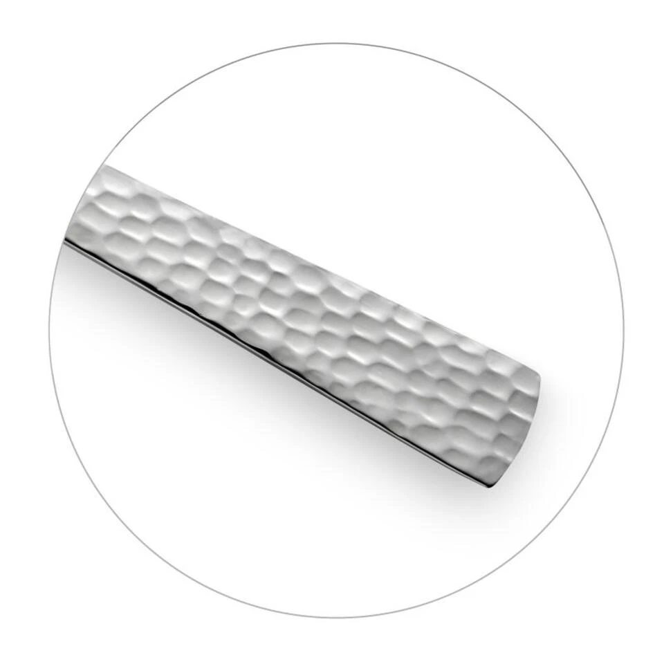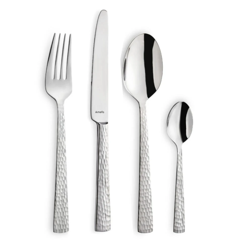 Felicity bestek van Amefa brengt het gevoel van eigentijds handwerk op tafel door de grove, gehamerde decoratie op het heft. De gekleurde hoogglans afwerking geeft een stijlvolle en moderne twist aan elke tafelsetting. De gehamerde decoratie op het handvat zorgt voor een mooie reflectie op het bestek waarbij de glans perfect tot zijn recht komt.