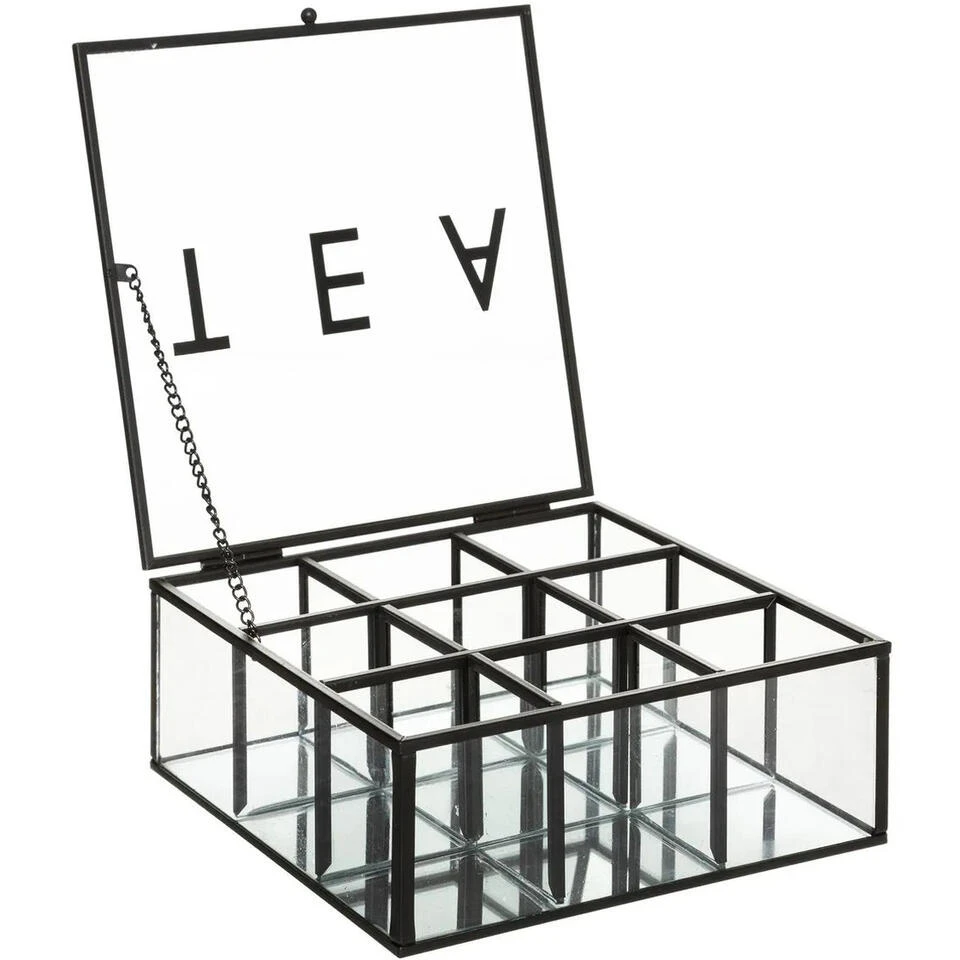 Theedoos/theekist industrieel zwart 9-vaks 18,5 x 17,5 cm van glas/metaal. Een theekist met 9 vakken, geschikt voor standaard formaat theezakjes. De deksel bevat de tekst Tea. Afmeting: ca. 18,5 x 17,5 x 7 cm. Materiaal: glas/metaal.