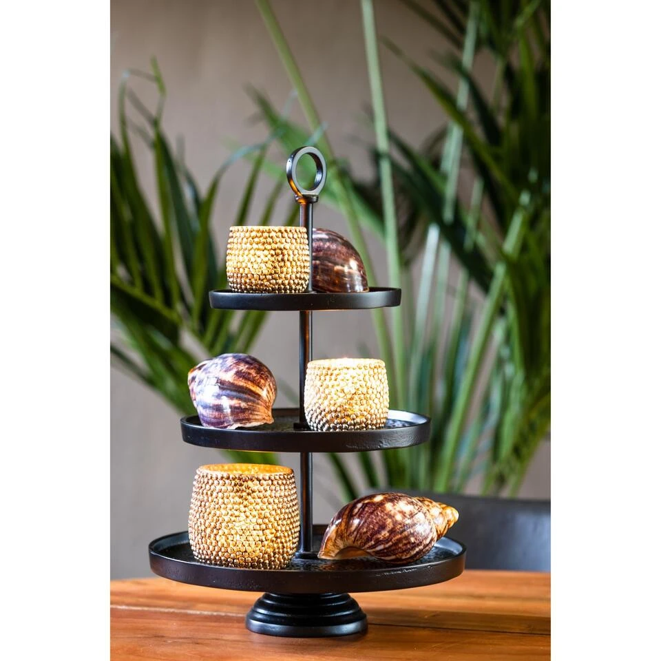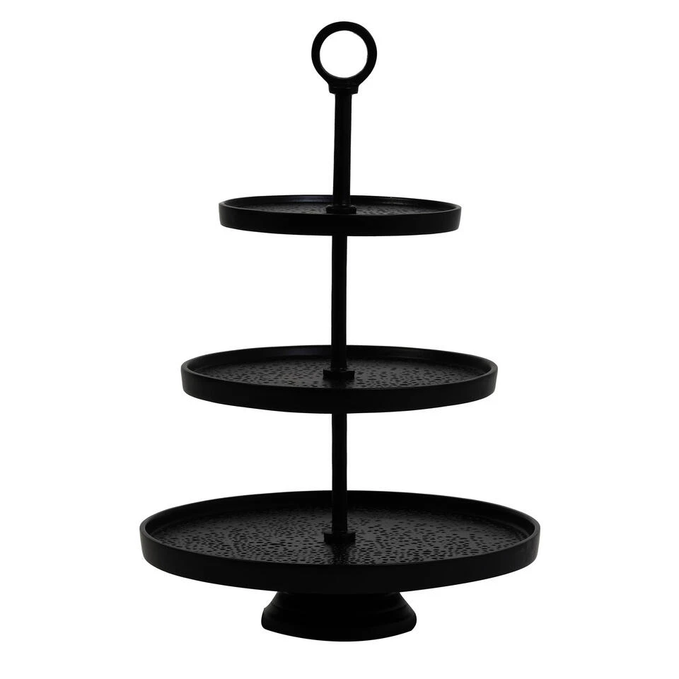 Een etagère op tafel zorgt meteen voor sfeer aan tafel. De Lutek etagère heeft precies de goede maten om gezellig op tafel te staan en heeft 3 lagen. Leg er hapjes op of wat kaarsjes en geef je tafel net dat extra feestelijke gevoel. De etagère heeft een zwarte kleur en is gemaakt van het metaal. De onafgewerkte details en het reliëf van de etagère maken hem super uniek. De bladen hebben een gatenpatroon wat voor een stoer effect zorgt. Hierdoor zou hij ook geweldig staan in een strak en modern interieur. De afmeting van de etagere is 32 x 32 x 48 cm. Door het handvat bovenop is de etagère makkelijk te verplaatsen en op te pakken. Deze etagere is niet geschikt voor de vaatwasser.