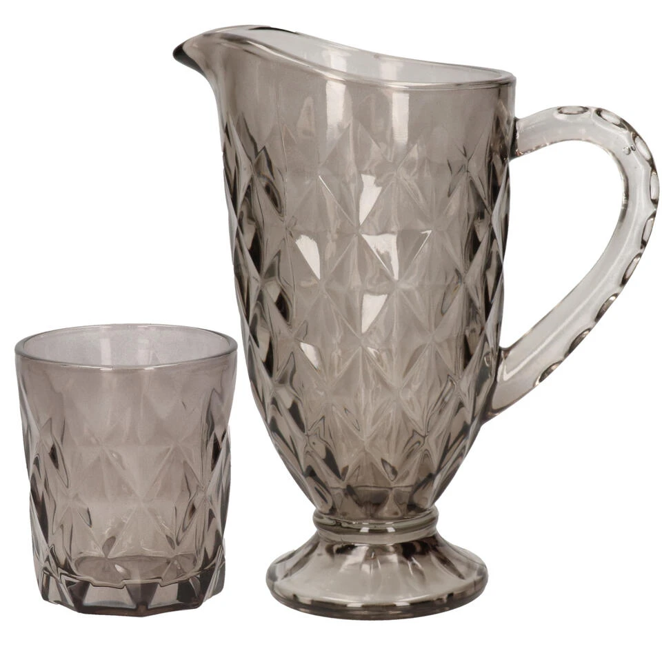 Complete set bestaande uit een karaf/schenkkan 1 liter en 6 drinkglazen 250 ml grijs. Materiaal: glas. Afmeting karaf: 14 x 21 cm. Afmeting drinkglazen: 14 x 7 cm.