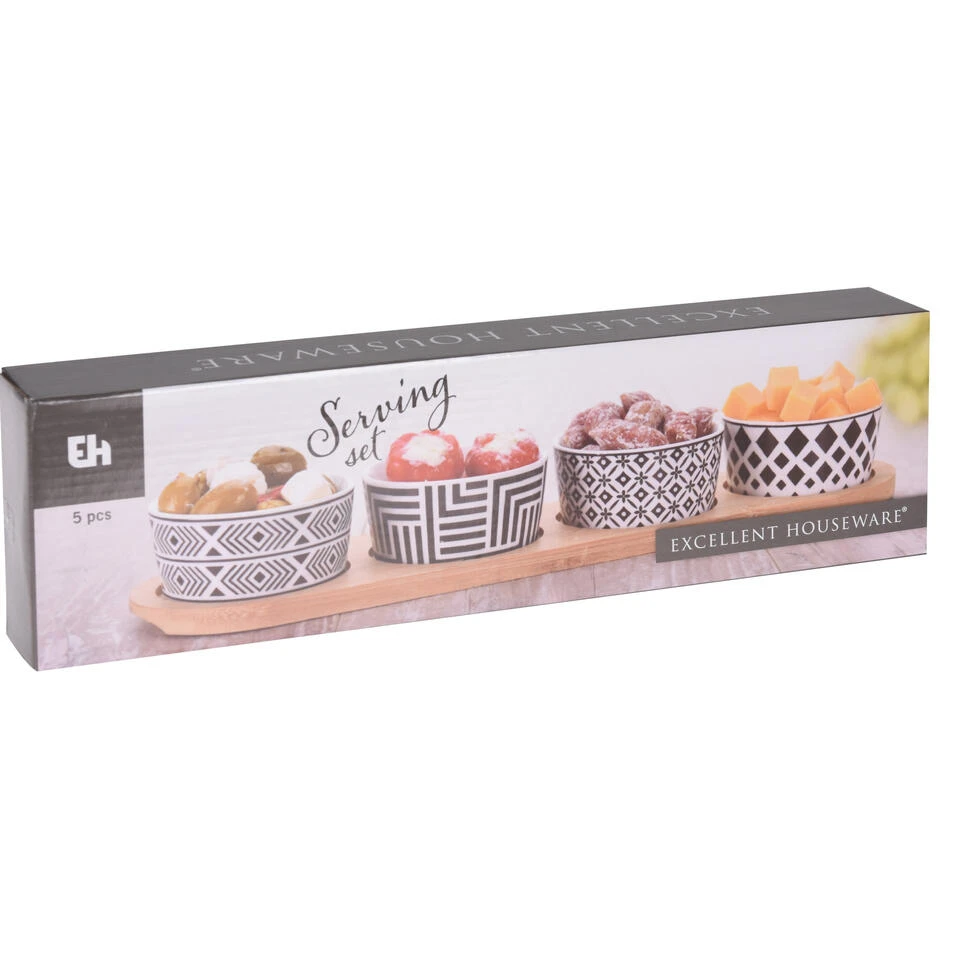 Excellent Houseware Serveerplank – Bamboe – 38x10cm – 4x Porseleinen Schaaltjes