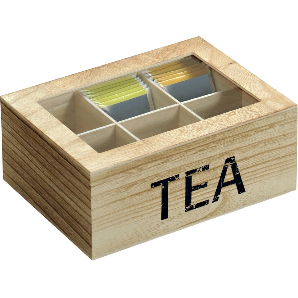 Houten theedoos/theekist met 6 vakken Tea 16 x 21,7 x 9 cm. 6-vaks theedoos voor het bewaren van diverse soorten thee/theezakjes. Met doorzichtig deksel en op de voorzijde staat de zwarte tekst: TEA.