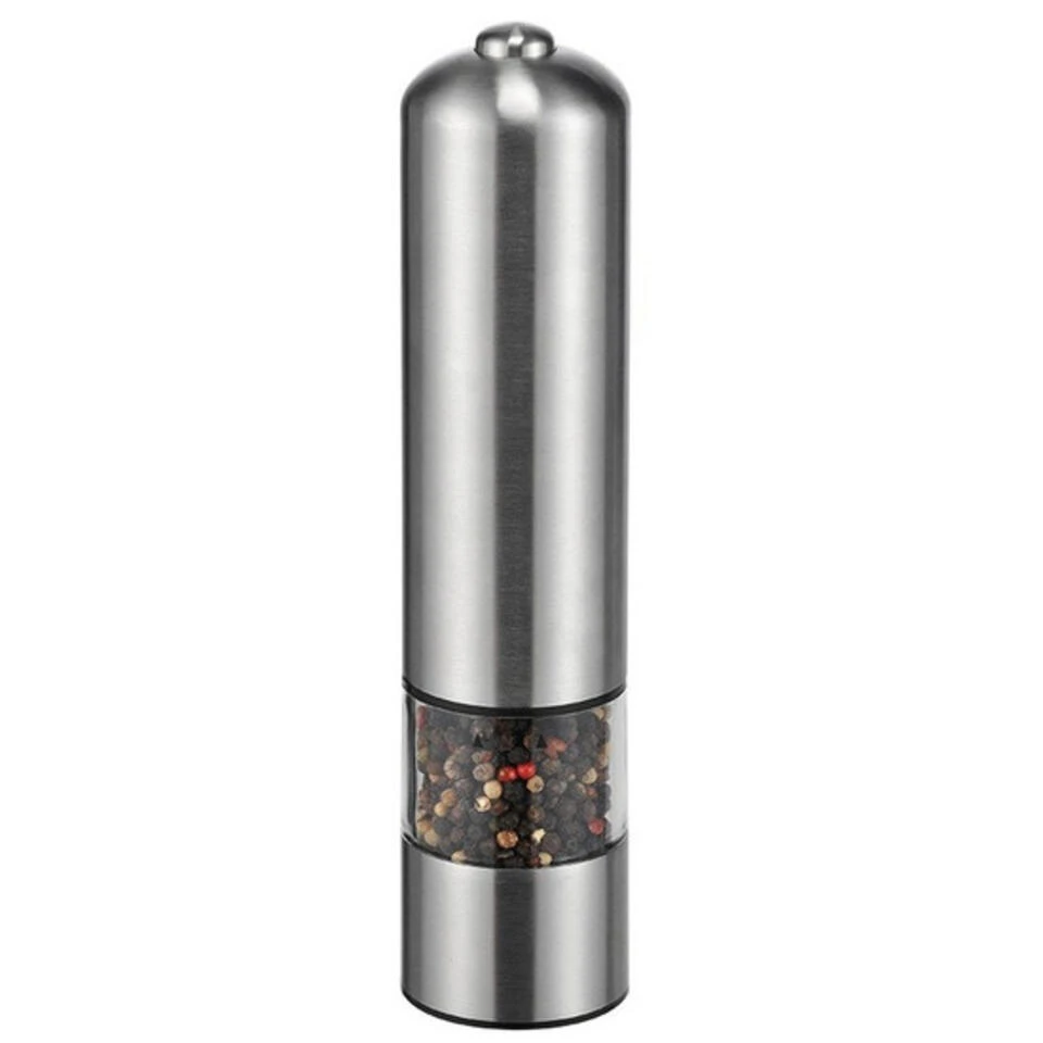 Elektrische zout- of pepermolen RVS. Elektrische zoutmolen of pepermolen van roestvrijstaal. De molen is makkelijk met een hand te bedienen, doordat deze automatisch begint te malen wanneer deze ondersteboven gehouden word. Inclusief lichtfunctie zodat u kunt zien wat u maalt. De molen werkt op batterijen (niet inbegrepen). Niet geschikt voor in de vaatwasser. Geschikt voor zeezout, peper en gemalen specerijen. Formaat: 5 x 22,5 cm. Keukenbenodigdheden pepermolens/zoutmolens met soft grip.