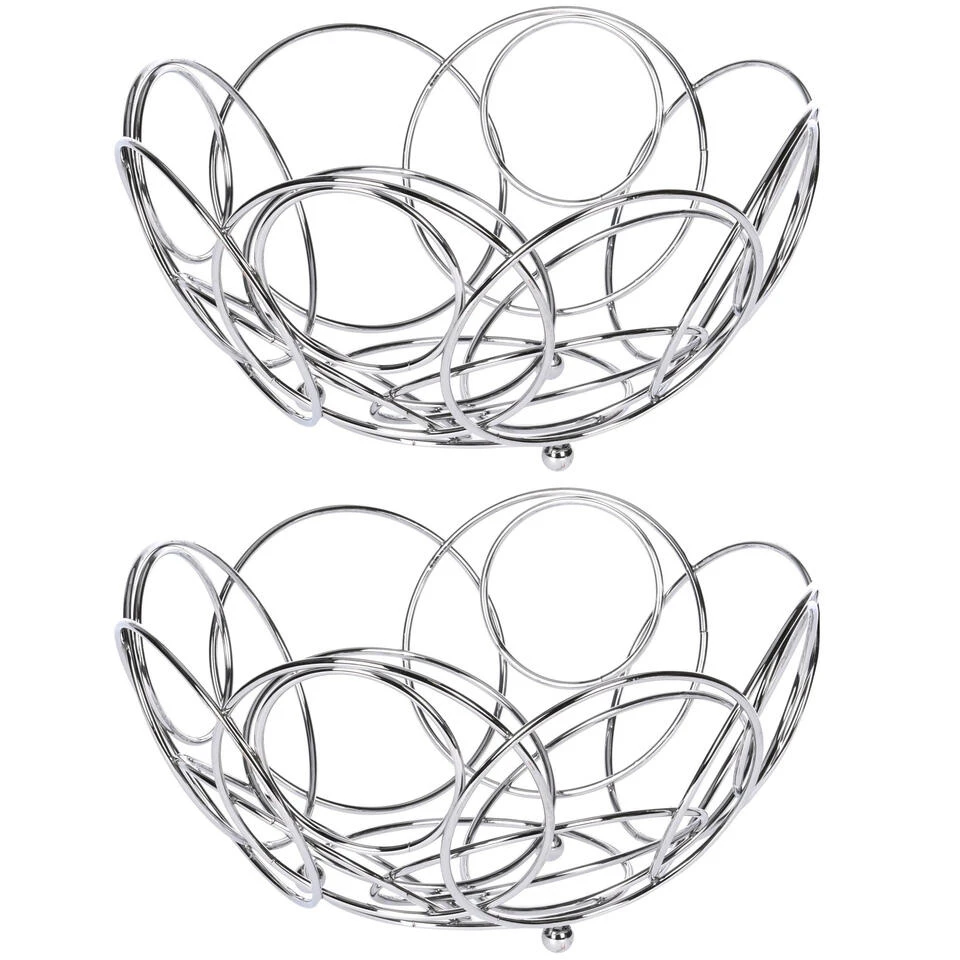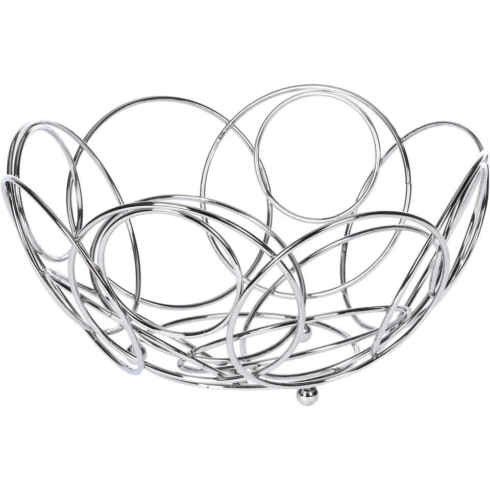 Ronde fruitschaal zilver 26 cm van metaal. De (deels) open rand/wand zorgt voor een constante luchtcirculatie waardoor het fruit minder snel overrijp is.De schaal kan ook uitstekend worden gebruikt voor het serveren van verse broodjes, deze blijven knapperig doordat de schaal open is. Afmeting: ca. D26 x H13 cm. Materiaal: verchroomd metaal. Reinigen: afnemen met vochtige doek.