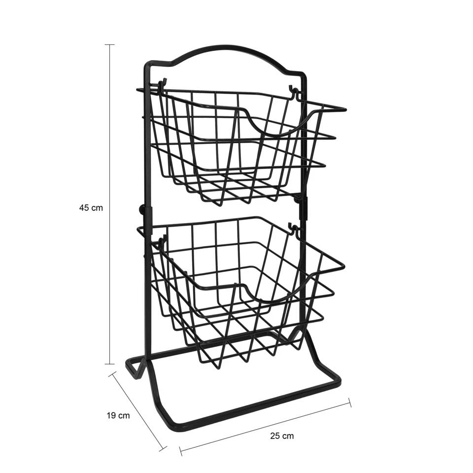 Het ontwerp van deze decoratie schaal past in diverse woonstijlen. Bijvoorbeeld in een landelijk of industrieel interieur past deze stoere fruitschaal perfect. Door de mandjes blijft het fruit bovendien altijd goed in de schaal liggen. Zo heb je geen last van wegrollende appels. Dat is wel zo praktisch.