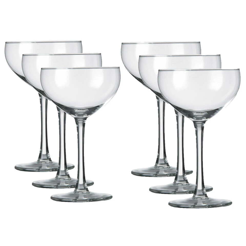 Set van 6x stuks champagneglazen/coupe transparant. Inhoud: 240 ml (24 cl). Materiaal: glas. Doorsnede glas: 9 cm. Hoogte glas: 15 cm. Diameter boven: 9 cm. Diameter midden: 9 cm. Diameter onder: 7 cm. Verpakking: luxe doos. Geschikt voor: vaatwasser. Geschikte dranken: champagne. Zoek voor meer glazen in deze serie op: Specials.