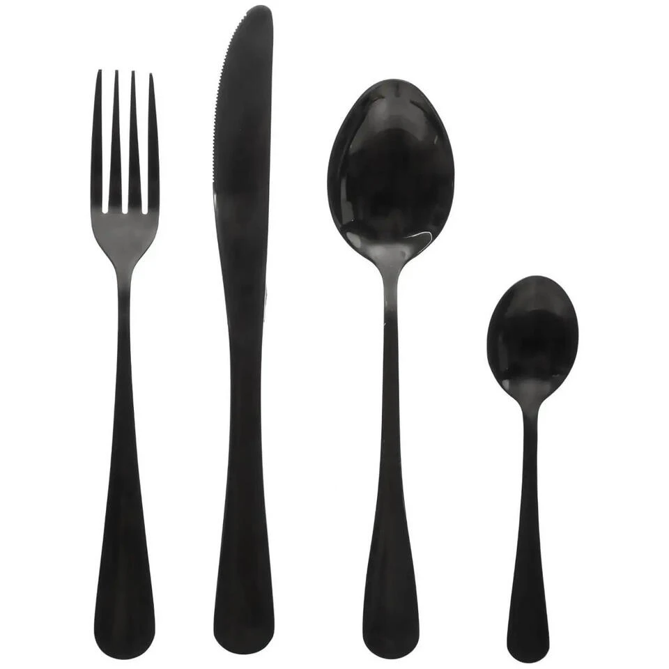 16-Delige bestekset Shadow zwart. Dek de tafel met deze moderne complete bestekset geschikt voor 4 personen. De set bestaat uit 4x messen, 4x vorken, 4x lepels en 4x koffie/theelepeltjes. Materiaal: RVS. Vaatwasserbestendig