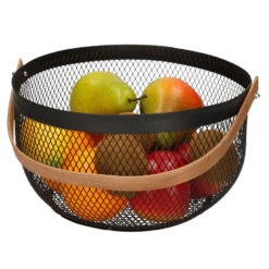 Fruitschaal/fruitmand met handvat rond zwart metaal 29 cm. De opengewerkte schaal zorgt voor een constante luchtcirculatie waardoor het fruit minder snel overrijp is. Afmeting: ca. D29 x H15 cm. Reinigen: afnemen met een vochtige doek. Fruitschalen/fruitmanden/draadmanden.