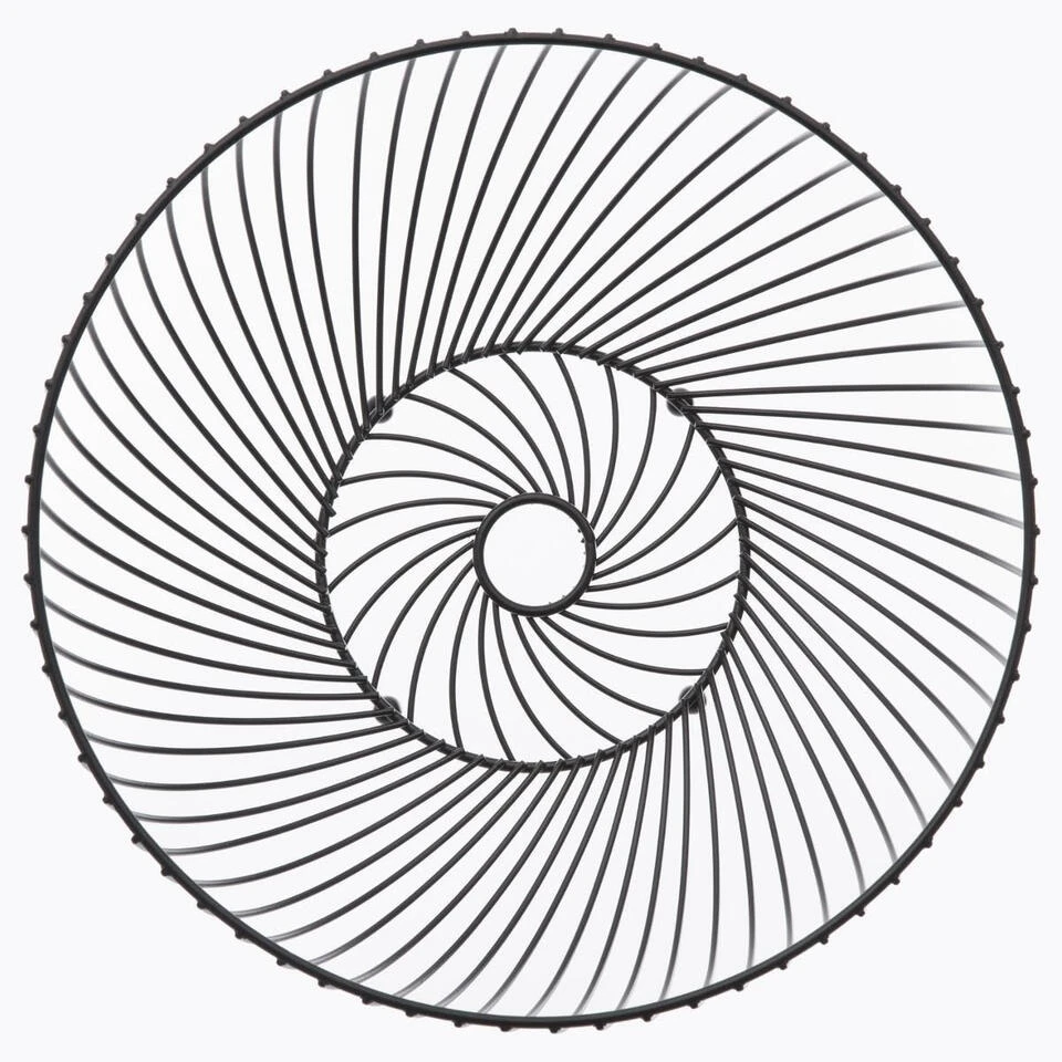 Fruitschaal/fruitmand rond zwart metaal 30 cm. De opengewerkte schaal zorgt voor een constante luchtcirculatie waardoor het fruit minder snel overrijp is. Afmeting: ca. D30 x H12 cm. Reinigen: afnemen met een vochtige doek. Fruitschalen/fruitmanden/draadmanden.
