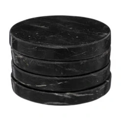 Set van 4x ronde onderzetters voor glazen zwart. Deze onderleggers zijn uniek omdat ze allemaal lichtelijk van elkaar verschillen en hebben daardoor een stijlvolle uitstraling. Afmeting: ca. 10 x 10 x 1,5 cm. Materiaal: Marmer.