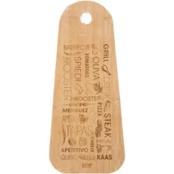 Tapas serveerplank rechthoek 45 x 19 cm van bamboe hout. Stevige houten plank met duimgat voor beter houvast en verschillende tapas teksten, de achterkant van de plank is blanco. Om de kwaliteit van de plank te behouden, is het aan te raden deze af en toe in te wrijven met een beetje plantaardige olie. Afmeting: ca. 45 x 19 x 1 cm. Materiaal: bamboe hout. Reinigen: hand afwas met een klein beetje mild afwasmiddel.