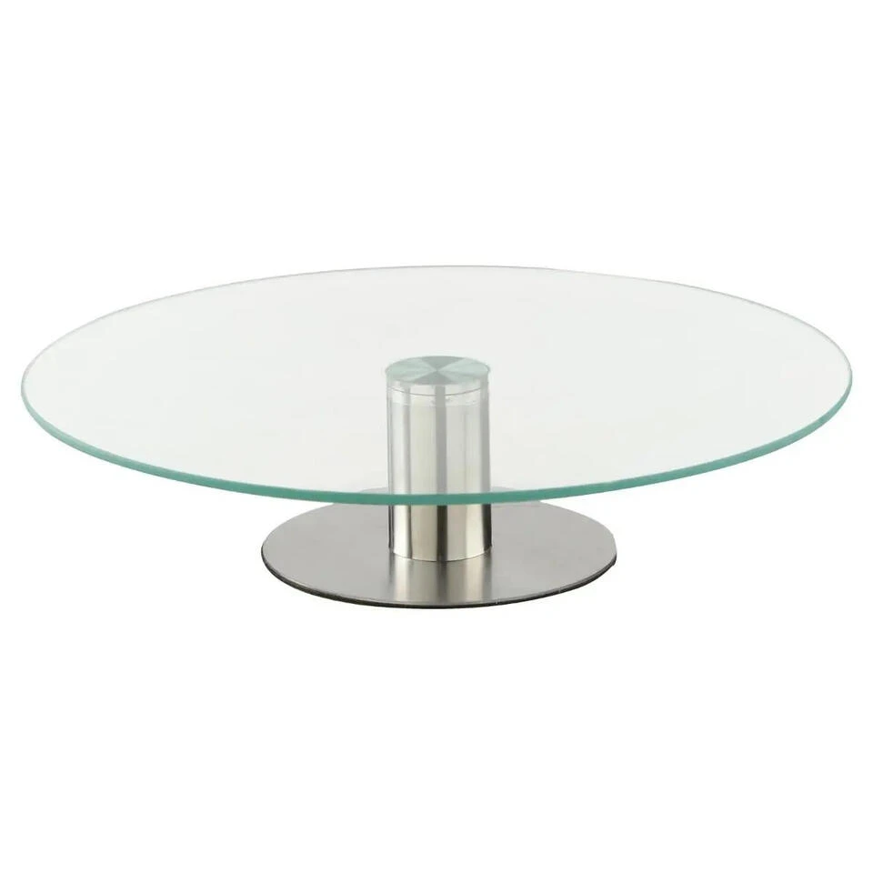 Serveerschaal/taartplateau glas. Dit elegant serveerplateau beschikt over een contrasterende metalen voet met daarboven een rond draaiend glazen blad. Ideaal om taart, cake, gebak, koekjes, of bonbons op te serveren. Niet vaatwasserbestendig. Materiaal: glas/RVS. Afmeting: ca. D30 x 7 cm.